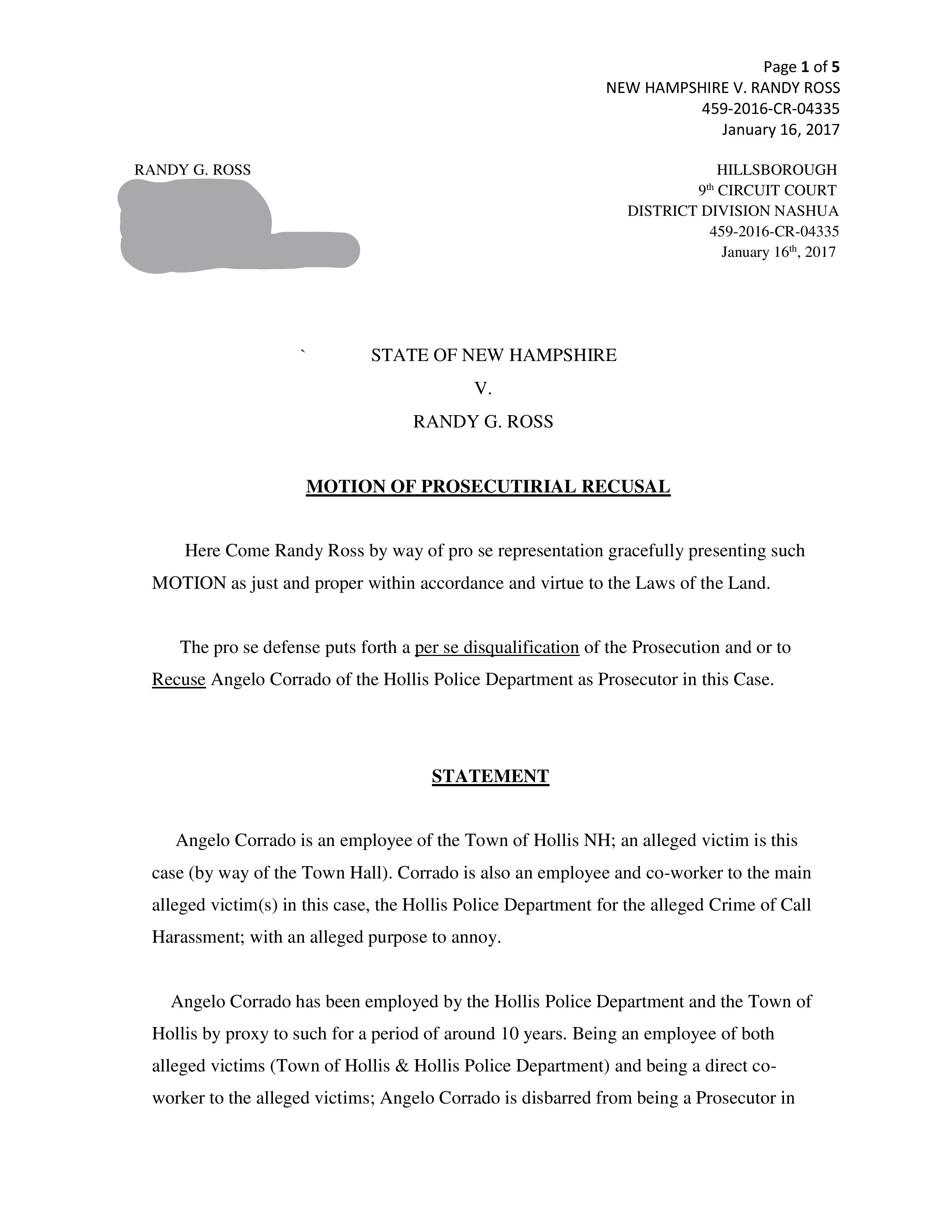 MOTION OF PROSECUTIRIAL RECUSAL 1-16-17